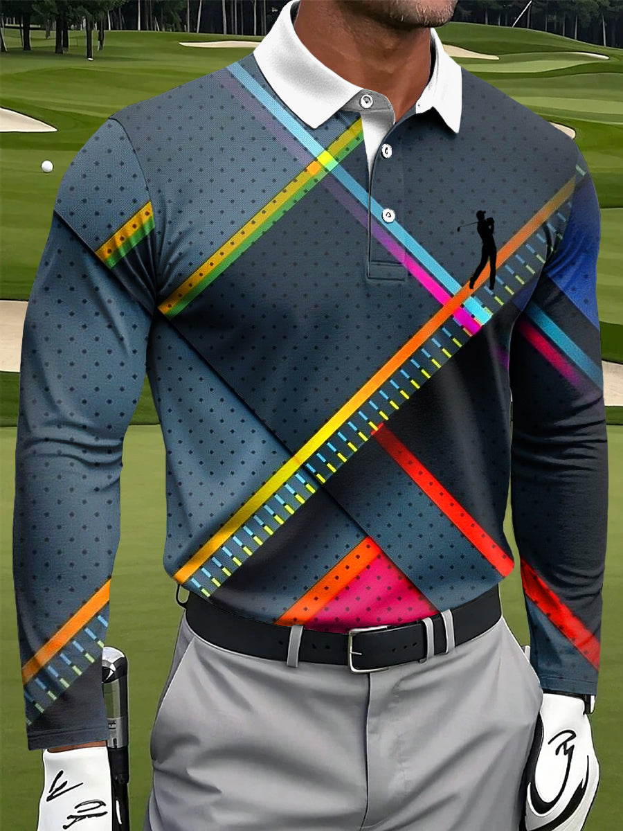 Мъжки ретро колоритен картинен артистичен печат случайни бизнес поло с дълги ръкави