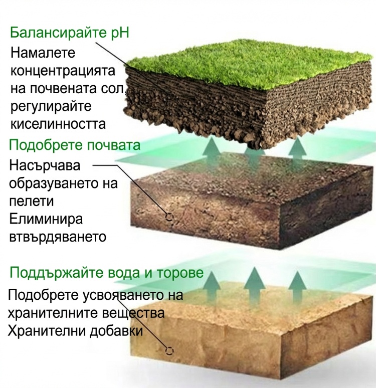 Стабилизира pH на почвата за по-бързо усвояване на хранителни вещества.